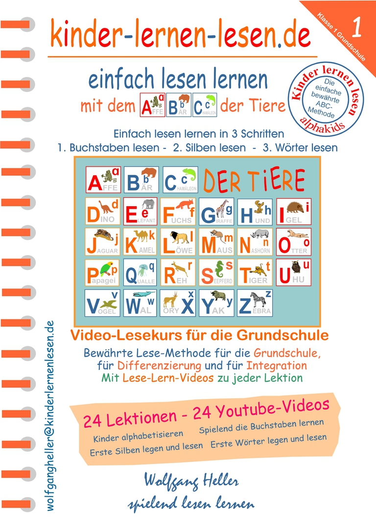 Das Heft enthält die Anleitung zum Kurs, die 24 Lektionen und dazu zwei Doppelseiten mit den Ausschneidebuchstaben des ABCs der Tiere. Auf der Rückseite können Kinder mit Eltern oder Geschwister die