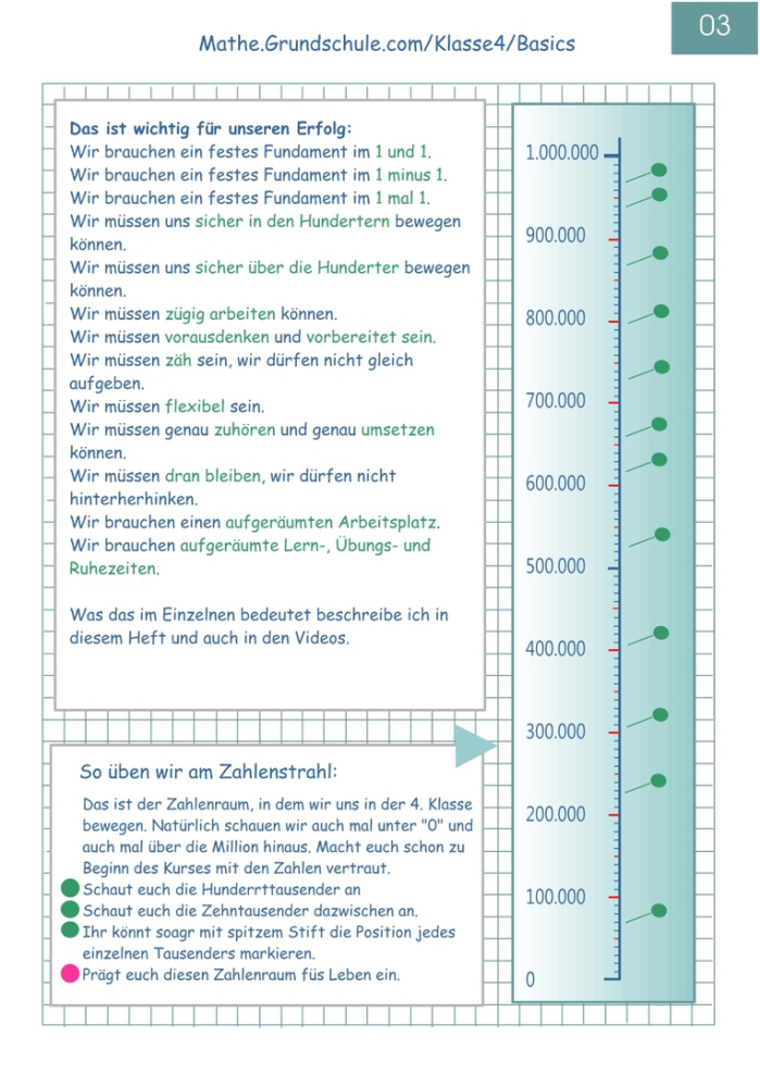 Zahlenübungen auf den ersten Seiten zu beginnen. Weitere Seiten folgen täglich. Wenn wir uns im Zahlenraum bis zur Million gut auskennen, kommen die 4 Grundrechenarten dran.