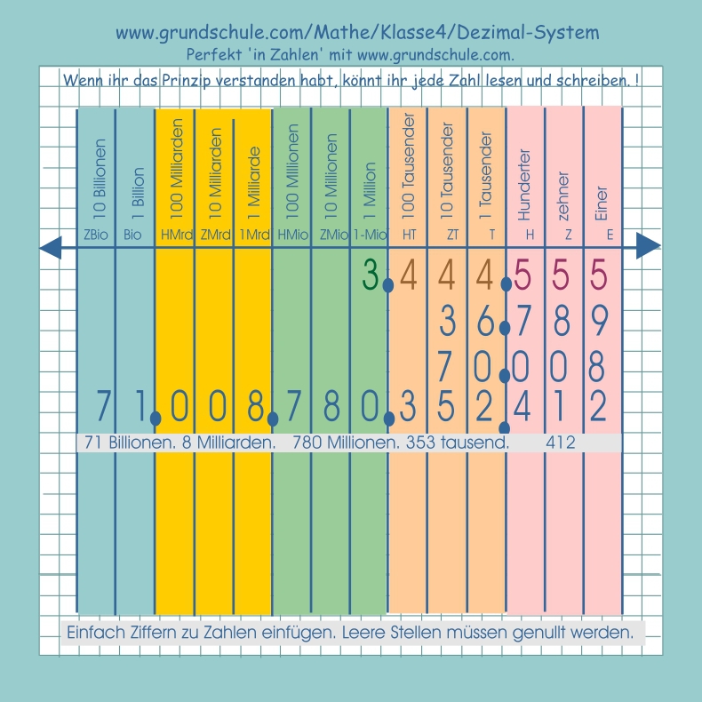 In der Grundschule ist normalerweise mit der Million Schluss nch oben. Mit meinen Klassen bin ich aber gerne auch über diese Grenze hinaus gegangen. Mit der Tabelle oben und dem Pinzip der Dreier-Gruppen haben wir zusammen jede beliebige noch so große Zahl geschrieben und gelseen. Es waren spannende Szunden, die den Kids so richtig Spaß gemacht haben. Wir lernen das hier auch im Mathekurs 4. Wenn ihr das Prinzip erst verstanden habt, wie unser zahlensystem aufgebaut und organisiert ist, könnt ihr bald jete beliebe zahl schreiben und einordnen. Dann könnt ihreuch wirklich im unbegrenzten Zahlenraum bewegen: Millionen, Milliarden, Billionen, Billiarden, Trillionen, Trilliarden, .....